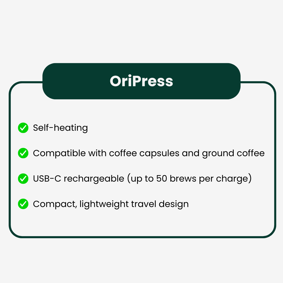 The OriPress is Australia's #1 compact, travel-friendly espresso machine that lets you brew coffee anywhere. It’s compatible with Nespresso® pods, normal pods and ground coffee. The OriPress heats up in seconds and delivers delicious espresso every single time. Easy to clean and lightweight, this sleek device will be your favourite travel companion.