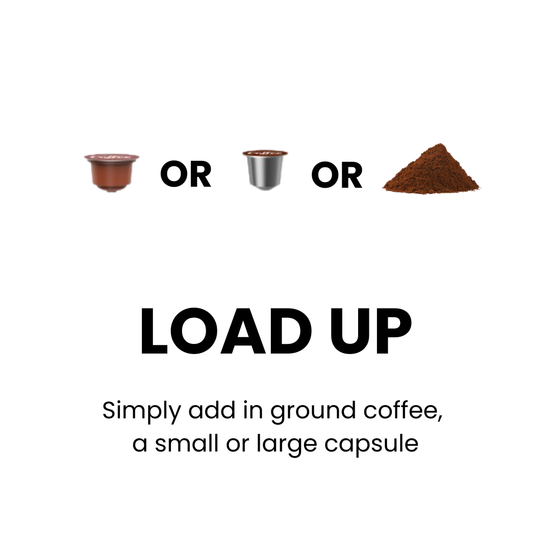 Nespresso‑style small or store bought large capsules. Also included is a ground coffee adapter so you can use your own beans!